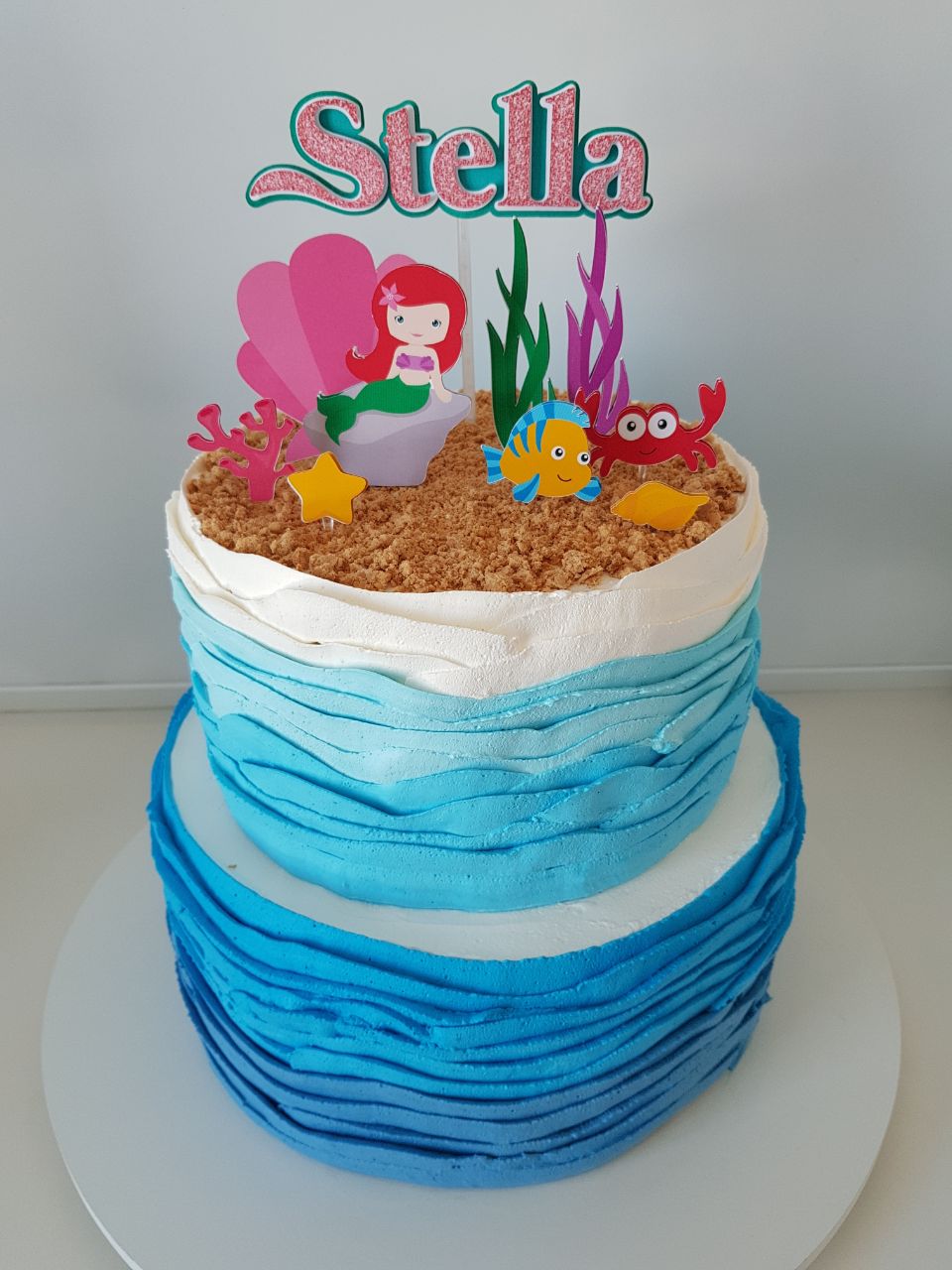 Bolo dois andares, M e P, decorados com efeito ondas do Mar em Chantininho e toppers em scrap personalizados.