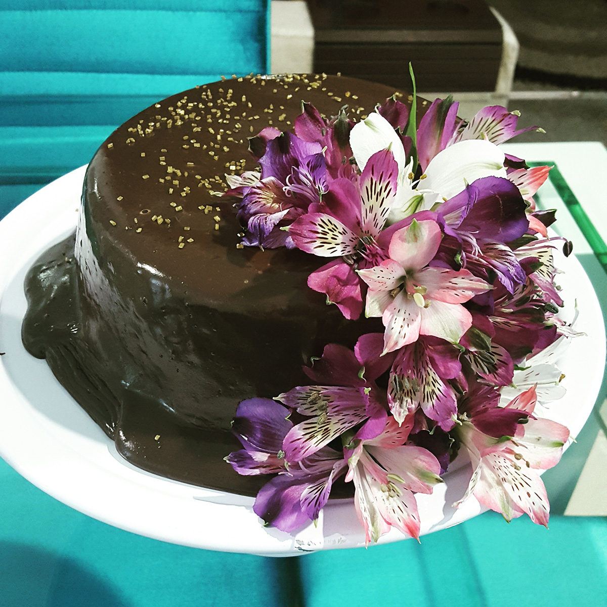 Bolo de Chocolate 50% cacau com cobertura de chocolate meio amargo.
