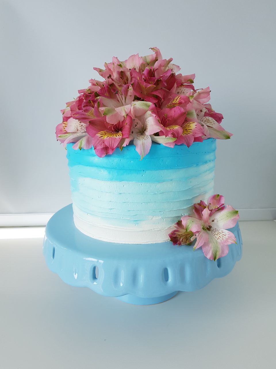 Bolo espatulado P, decorado com chantininho em degrade e Bouquet de Astromélias.