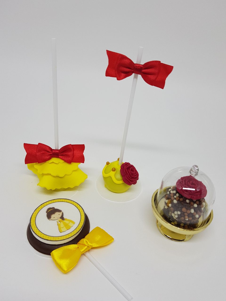 Mini cúpula com brigadeiro e Rosa vermelha, Cakepop e Pirulito de Chocolate da princesa Bela.