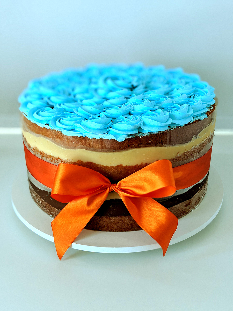 Naked Cake com acetato garantindo fartura de recheio e segurança no transporte!