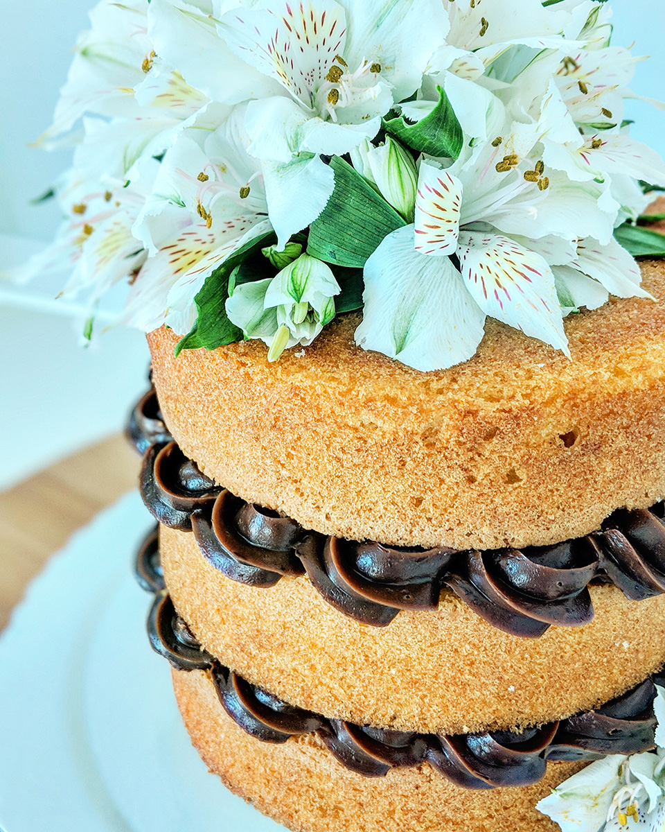 Naked Cake de Baunilha, recheado com brigadeiro de chocolate e Astromélias para decorar.