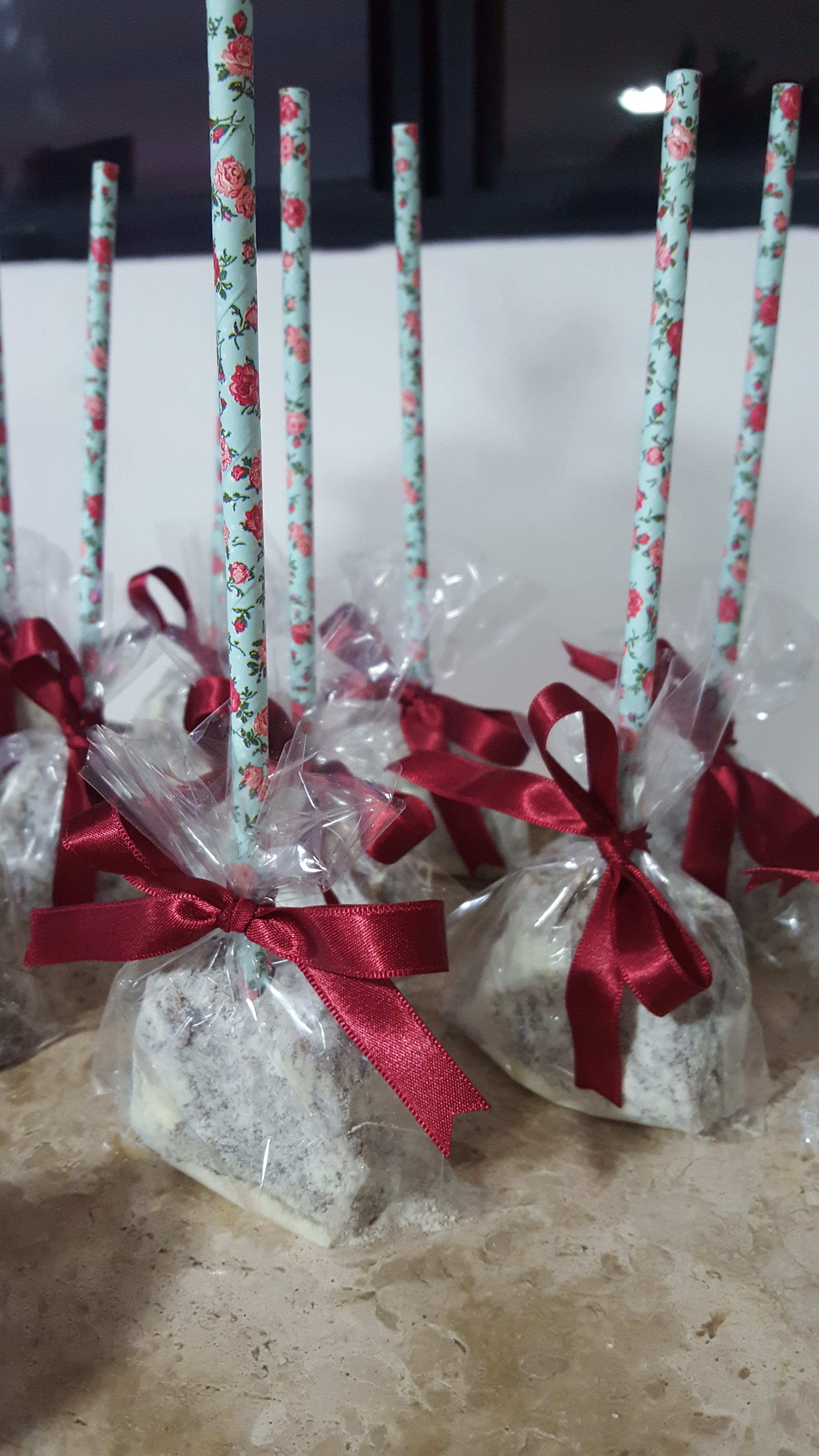 Palha Italiana no palito, embalada e finalizada com fita de cetim.